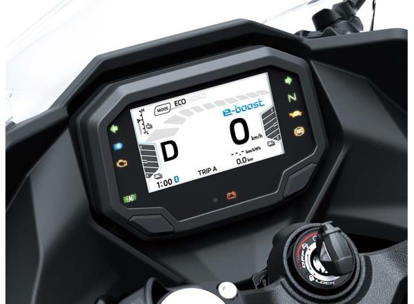 With e-boost, riders can access increased power for approximately 15 seconds. When activated, acceleration is stronger and top speed is increased: 64 km/h >> 75 km/h (ECO), 88 km/h >> 99 km/h* (ROAD). [62 km/h >> 72 km/h (ECO), 85 km/h >> 99 km/h* km/h (ROAD) for Z e-1] *EUR spec: Top speed limited to 99 km/h in Europe.