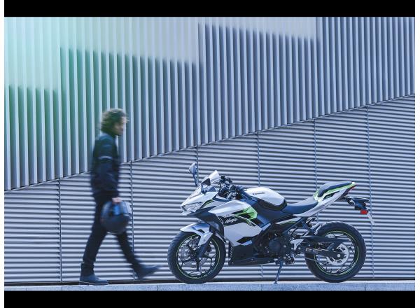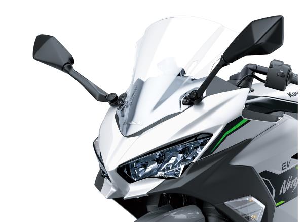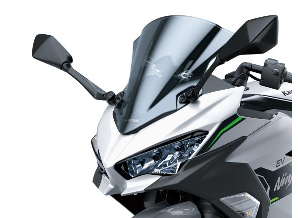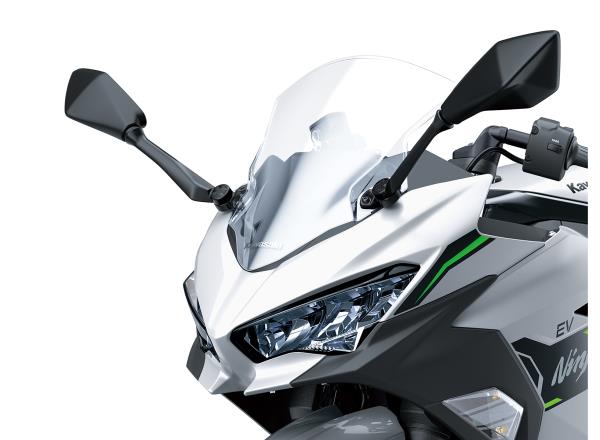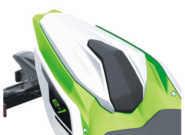 Like its Ninja brethren, the Ninja e-1 features seductive, fullfairing bodywork. The large-volume bodywork attracts attention and gives the impression of a larger machine. This impression is reinforced by the high-class design and superb fit and finish, which are comparable to bikes from a larger-displacement class. All-LED lighting contributes to a modern, high-tech image.