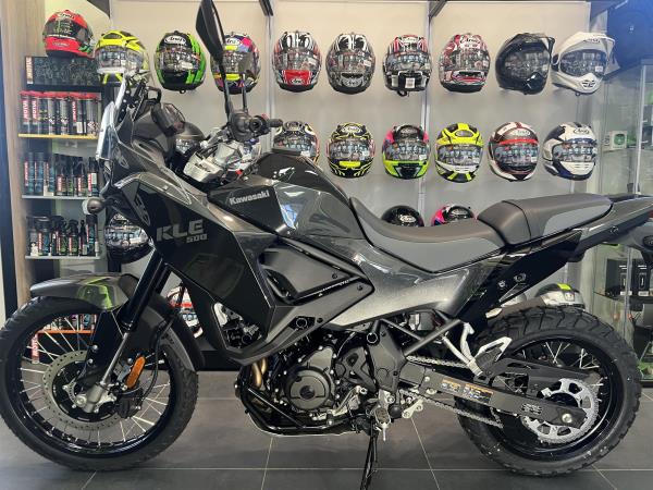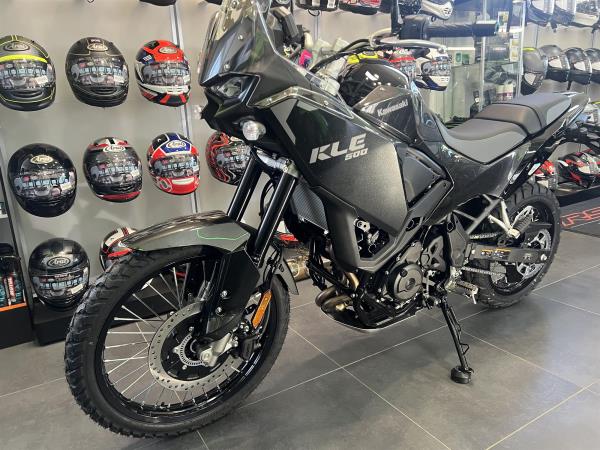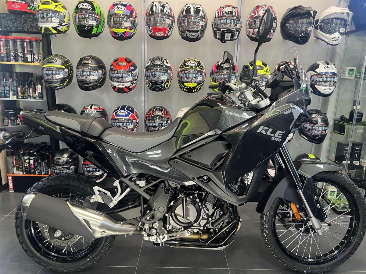 2026 KAWASAKI KLE 500 IN METALLIC CARBON GREY. LIFES A RALLY, RIDE IT. IN STOCK NOW WE HAVE THE COMPLETE KLE 500 RANGE. ITS PURPOSEFUL RALLY STYLE DESIGN IS A PRIME EXAMPLE OF FUNCTIONAL BEAUTY THAT NOT ONLY LOOKS THE PART BUT DELIVERS VERSATILE PERFORMANCE BOTH ON AND OFF PAVEMENT. WITH A RESPONSIVE AND TORQUEY FUEL INJECTED PARALLEL TWIN ENGINE COMBINED WITH A WELL BALANCED CHASSIS. WETHER YOU’RE A COMMUTER LOOKING FOR AN ADVENTURE MOTORCYCLE WITH CIVILIZED ROAD MANNERS THE NEW KLE IS YOUR PASSPORT TO A WORLD OF POSSIBILITIES. FEATURES INCLUDE SELECTABLE ABS, MULTIPLE SEAT OPTIONS CATERING TO ALL RIDERS, MULTI PURPOSE TRELLIS FRAME, LCD INSTRUMENTATION, PREMIUM SUSPENSION, TOUGH OFF ROAD WHEELS. IN STORE NOW FOR JUST £6144. INCLUDING A 4 YEAR WARRANTY AND YOUR FIRST YEARS ROAD TAX. FROM 6 TIME WINNER OF KAWASAKI DEALER OF THE YEAR. COLERAINE KAWASAKI