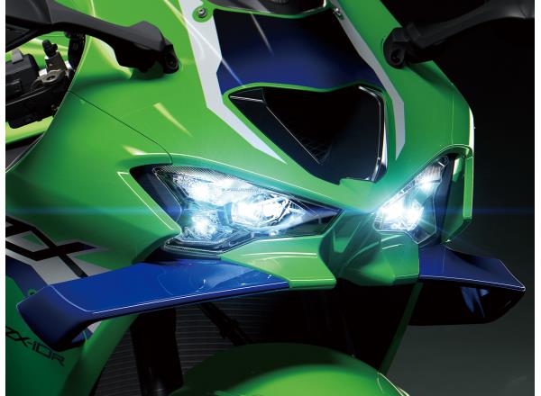Compact projector/reflector hybrid headlights, repositioned Ram Air intake and prominent new winglets give the Ninja ZX-10R its new “face,” enhancing the strong Ninja family image. All-new sharp, aggressive bodywork creates a dynamic image that completes the next-generation Ninja styling.
