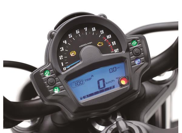 Original-design instrumentation cluster features an analogue-style tachometer and multi-purpose LCD. Convenient features keep riders fully informed of operating conditions.