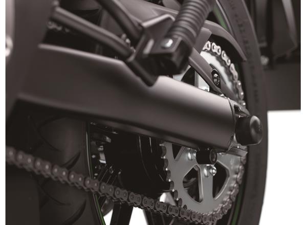 Offset laydown single-shock rear suspension is equipped with linkage to enable a longer stroke for increased ride comfort. The rear suspension arrangement also contributes to the bike’s compact design, freeing up space for a large-volume silencer under the engine. Rear shock features adjustable preload, with 7 positions to suit rider size and payload.