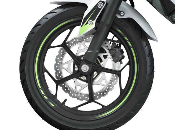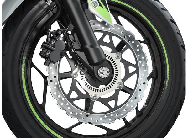 Front and rear disc brakes offer impressive stopping performance. Dualpiston calipers grip a ø290 mm disc up front, and a ø220 mm disc at the rear. Petal disc design adds to the sporty Kawasaki looks.