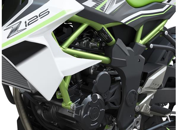 The Z125 features a full-size chassis. With a slim, compact trellis frame, sporty suspension and lightweight 17” wheels, the light, nimble handling they offer is ideal for new riders to become familiar with operating a full-size motorcycle. Slim, compact trellis frame Trellis frame enables a slim, compact package that is easy to manage, and makes it easy to reach the ground with your feet